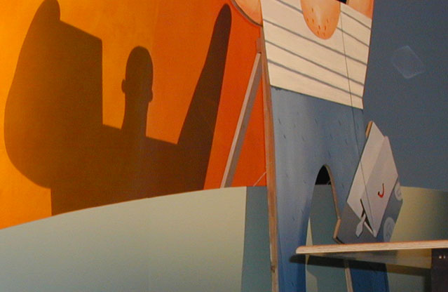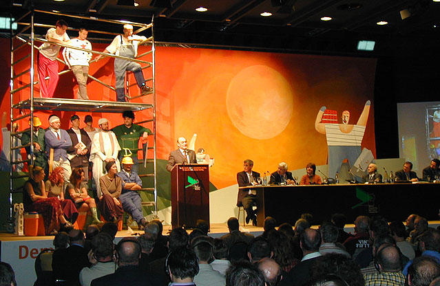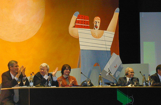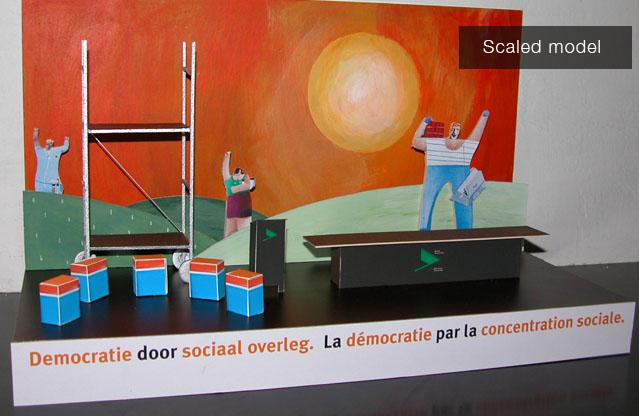 The stage was built in a dynamic atmosphere for a congress of ‘Trade union for construction and industry’ with particular elements of the building industry like scaffolding, characters of this trade, refrigerator boxes that served as seats for fluent dialogues and furniture made in betonplex were part of the event. All elements were made only of cut-out (3D) and painted pieces.